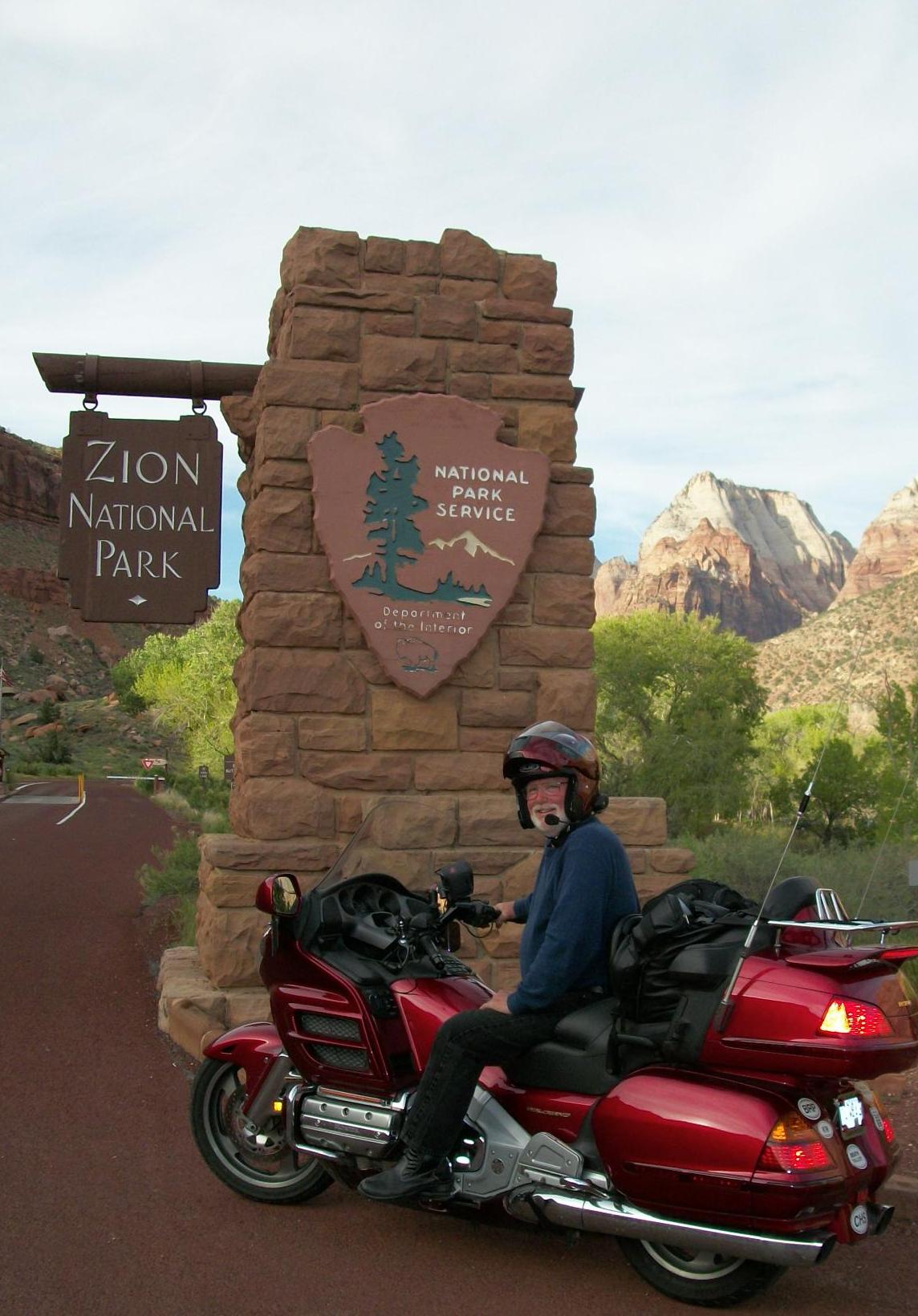 When you finally arrive at the entrance to Zion National Park, it’s almost a letdown. After the winding, climbing ride past the colorful mountains that flank both the highways and the smaller approach roads, you might ask yourself, where’s the grandeur, the epic size, and scenic wonder? The unspectacular rock column marking the gate offers no hint of the stunning beauty and towering delights that await within. I got there in early afternoon, registered for my campsite, and quickly set up my home base for the day’s ride of discovery. It was a highly gratifying experience, but a menace to safe riding as the eye was distracted time after time from the roadway to the spectacle above and all around the twisty mountain track,
