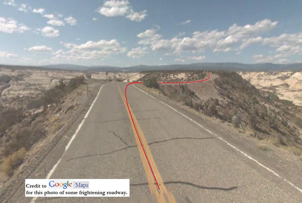 It wasn’t far from that wintry plateau that I experienced for the first time the unsettling phenomenon I call the “ridge road.” It’s a section of the highway where the steep falloff to the canyon below doesn’t occur on the right side of the bike or on the left side, but on both sides simultaneously. I’ll have to ask you to accept my description of it and this “borrowed” photograph because I wasn’t about to go back and ride the unnerving stretch again just to take pictures of it.