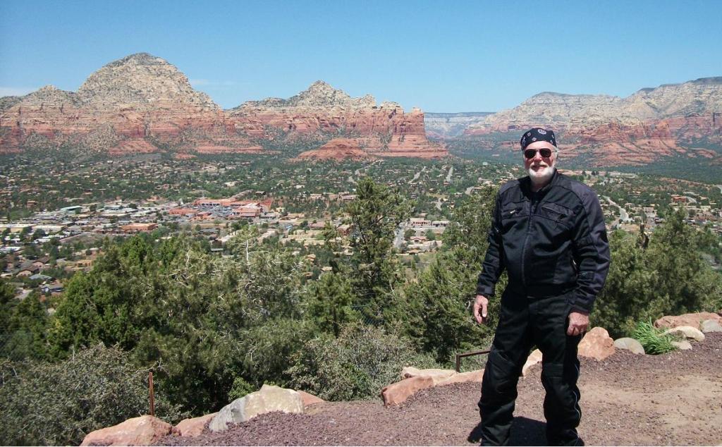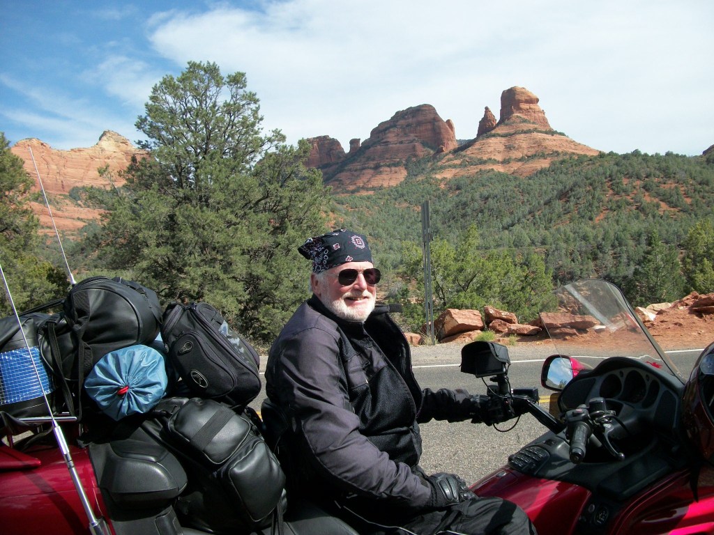 I should make one more point before moving on to the next page in this memoir. I have called the segment you’re reading High Plains Rider, and after I rode south out of Colorado and into the furnace of the real southwest, you might have thought that title misplaced. So I want to share with you a startling lesson from my southwest tour. With the exception of Sedona and Cottonwood, all of the locations described on this page are actually higher in elevation than Denver, Colorado. Flat, arid, desert landscapes they might be, but they are closer to heaven than you might ever have imagined. Denver justifiably boasts of its mile high status at an official elevation of 5,280 feet. But Albuquerque tops Denver by 30+ feet (5,312 ft). My panic rest stop in Laguna, NM, was more than 500 feet higher (5,807 ft). Show Low (not “low,” at all) is almost a thousand feet higher than Denver (6,213 ft). Flagstaff is 1600 feet higher up (6,910 ft). And Santa Fe soars almost two thousand feet above The Mile High City at 7,260 feet. It was clear as I rode south out of Flagstaff and toward the Red Rock Country that the steep canyon roads were carrying me to lower elevations. I passed briefly among woodlands and rolling streams that were a welcome relief after the sparse landscapes to the north. But beautiful, classy Sedona (4,326 ft) and peaceful, laid-back Cottonwood (3,314 ft) are both thousands of feet higher than my home port of Atlanta, and I extend my High Plains status to them, as well.